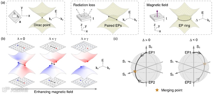 图1. (a)左图:二维光子晶体中线性色散的狄拉克点。中图:在光子晶体平板中,狄拉克点演化为一对由费米弧连接的EPs。右图:在外加磁场下,EPs在扩展参数空间中形成闭合环。(b) 动量空间中EPs及偏振态随磁场增强的演化。(c) 不同磁场强度下EPs在庞加莱球上的演化轨迹。