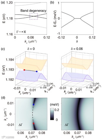 为了验证理论预测,研究团队设计了具体的磁光光子晶体平板结构进行数值模拟。通过引入磁光介电张量,研究团队能够精确描述外加磁场对光子能带的调制效应。结果完美验证了理论模型的预测(图2)。当磁光参数δ=0时,系统在动量空间中存在一条费米弧连接的一对EPs;随着磁场强度增加,费米弧逐渐收缩,EPs相互靠近;当磁光参数超过临界值时,EPs完全湮灭,两条能带的实部完全分开。