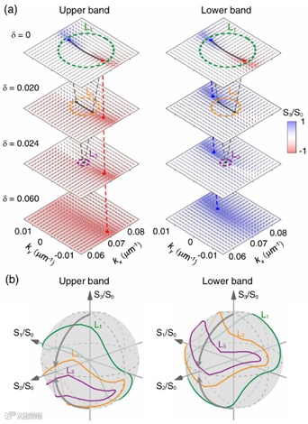图4详细揭示了偏振态的复杂演化机制。图4(a)展示了不同磁场强度δ下动量空间中偏振分布的变化。图4(b)通过庞加莱球面展现了围绕EPs的闭合回路上偏振态的演化轨迹,揭示了拓扑荷从费米弧向圆偏振点转移的完整过程,同时反映了磁场对于EPs的偏振性质的调控。