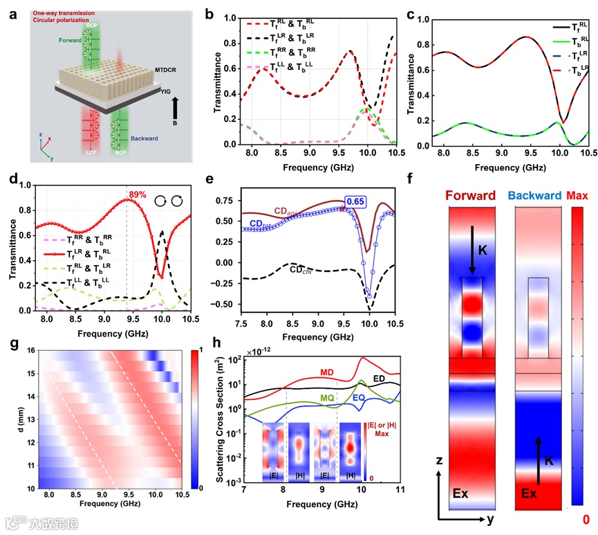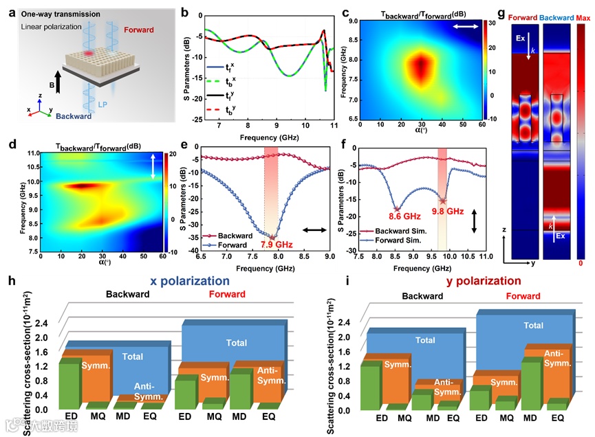 针对以上难题,本研究提出了一种亚波长宽带、极化复用非互易传输的磁光超表面设计方法。如图2h和2i所示,理论分析方面,基于Jones矩阵理论和多极子分解方法,系统揭示了器件非互易本质及其多极子物理机制。超表面单元结构属于C2磁点群结构,允许结构手性、omega型双各向异性及其非互易分量共存。MTDCR的旋转不仅引入了结构手性,还通过Pancharatnam-Berry几何相位实现了对不同极化态的独立调控。而YIG薄层的磁光响应则打破了时间反演对称性,实现了对圆极化波的选择性和方向性。两者形成的Mie-Fabry-Pérot混合共振,使得磁光双折射效应被显著增强,有效拓展了非互易传输的带宽。在工作频段内,YIG诱导的设计不对称性使米氏多极子之间产生磁电耦合,导致正反向激发下多极子组成不同。Mie共振主导的对称(ED、MQ)与非对称(MD、EQ)多极模式交叉耦合,后向入射激发偶极与四极子之间的相干增强,正向入射下多极子相消干涉形成能量的高反射与低透射。数值仿真与理论推导均表明,正反向传输系数的显著差异根源于多极子分量的非对称耦合及时空对称性的破缺,反向透射被有效抑制,能量主要以反射形式输出,器件整体吸收损耗维持在极低水平。