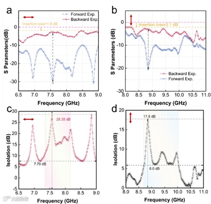 图3集中展示了超表面在圆偏振波入射下的非互易特性。通过结构手性与磁光效应的协同,器件对不同旋向的圆偏振波展现出显著的选择性和方向性。结果表明,正反向RCP和LCP入射下透射谱差异明显,圆二色性CD峰值可达0.65,且主要由结构各向异性和omega型双各向异性贡献。图4给出了超表面线偏振非互易传输的实验验证。实测x、y偏振下,器件分别在7.6 GHz和8.8 GHz获得了28.35 dB和17 dB的隔离度,带宽分别达到26%和16%。图5则验证了在圆极化入射和宽入射角条件下的非互易传输性能。实验表明,RCP前向透射率在9.4 GHz时高达94%,CD最大值达0.75,极化选择性强。样品实物图显示器件结构紧凑,易于大规模集成。实际测试还表明,该超表面可在0°至50°宽入射角范围内稳定工作。器件整体较薄、全介质、损耗极低,极易与现有微波系统集成,适用于非互易天线罩、雷达等应用场景。