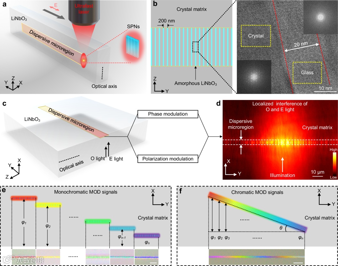 铌酸锂内部的色散微区主要由超快激光诱导的亚波长相变纳米条纹组成(图1a)。当超快激光聚焦于透明介质内部时焦点区域激发大量纳米等离子体,在局部场增强效应驱动下纳米等离子体各向异性生长,在焦点体积内产生周期性非晶化材料改性。以铌酸锂晶体为例,超快激光在铌酸锂晶体中形成的亚波长非晶态纳米条纹宽度约为20 nm,周期约为200 nm(图1b)。由于铌酸锂晶体和非晶相之间显著的折射率差异,根据有效介质理论,亚波长相变纳米条纹可以等效为视为人工各项异性介质层,对入射光的相位和偏振进行二次调制(图1c),从而在激光修饰区域建立O光和E光的频率相关干涉(图1d),干涉波长与O光和E光抵达色散微区时的相位差相关(图1e)。通过设计激光写入路径在晶体内部构建光楔结构,就可以产生连续变化的相位差,实现三维空间的微尺度光学色散(图1f)。