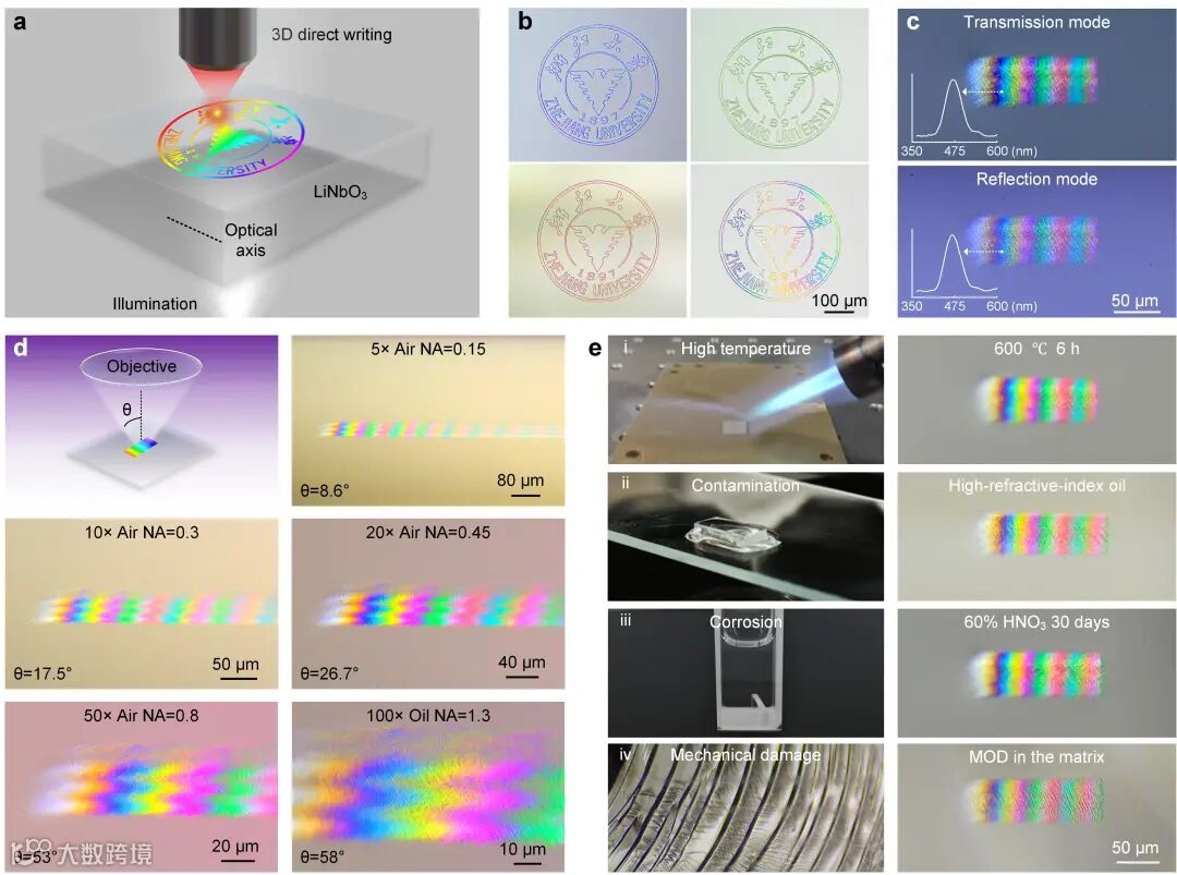 基于此策略创建的MOD元件展现出优异的性能(图3)。首先,光楔结构支持产生连续的宽带光学色散信号,构建的色散元件显示出涵盖紫外、可见光和近红外区域的超宽光谱响应,理论上仅受到铌酸锂晶体的透明窗口(370-5000 nm)的限制。亚波长相变纳米条纹引起的局部光调制使色散信号被有效限制在色散微区内,而不是在空间上发散。通过对纳米相变条纹区域成像即可直接获取色散信号,兼容透射和反射两种工作模式,且色散信号与成像视角无关。相较于传统精密光学色散元件,铌酸锂内部MOD结构在全无机晶体基质的保护下表现极强的稳定性,能够承受600 ℃高温、酸碱腐蚀、污染、机械损伤等各种极端环境,对震动等外部干扰均不敏感。此外,调整激光直写路径能够轻松定制色散微区形状,从而直接在三维空间中显示复杂的色散图案,在多维信息记录、光学加密和多级防伪等领域具有广阔的应用前景。