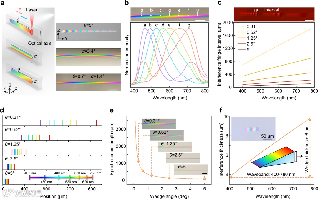 通过精准调控光楔角度及其取向,可以设计MOD的光学特性。例如,在三维空间中扭转色散微区能够精细调整其分光方向与模式(图2a, b);调节楔角大小则可控制不同频率光干涉条纹的间距,进而调控MOD的整体工作尺寸(图2c-e)。基于此原理,可将色散区域长度压缩至50µm,宽度减小至10µm,光楔厚度仅为6µm(图2f),即可实现整个可见光波段的有效色散。这使得基于传统架构的光学元件在尺寸上首次可与超材料相媲美。这种超紧凑设计使得MOD元件能够集成于包括块体材料、各类基板以及薄膜等多种衬底之中,展现出优异的通用性和集成潜力。