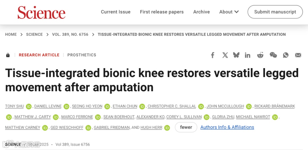 2025年7月10日,相关工作以题为“Tissue-integrated bionic knee restores versatile legged movement after amputation”发表在Science上。Tony Shu为第一作者兼通讯,Hugh Herr 教授为通讯作者。