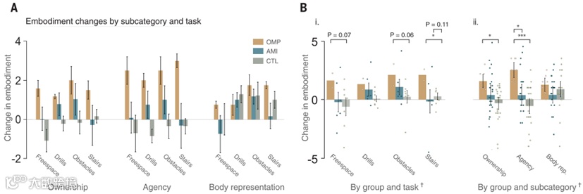 进一步从主观维度量化了“化身感”(图6)。在每轮实验后填写的问卷显示,骨整合组在“所有权”和“能动性”两项上显著高于传统组,并在楼梯任务后整体化身感提升最为明显。研究者指出,高保真信号、骨性力传递以及幻肢-机械动作的实时映射,共同塑造了这种“假肢即自体”体验,为未来评估截肢手术设计和假肢选型提供了新的自我感知指标。