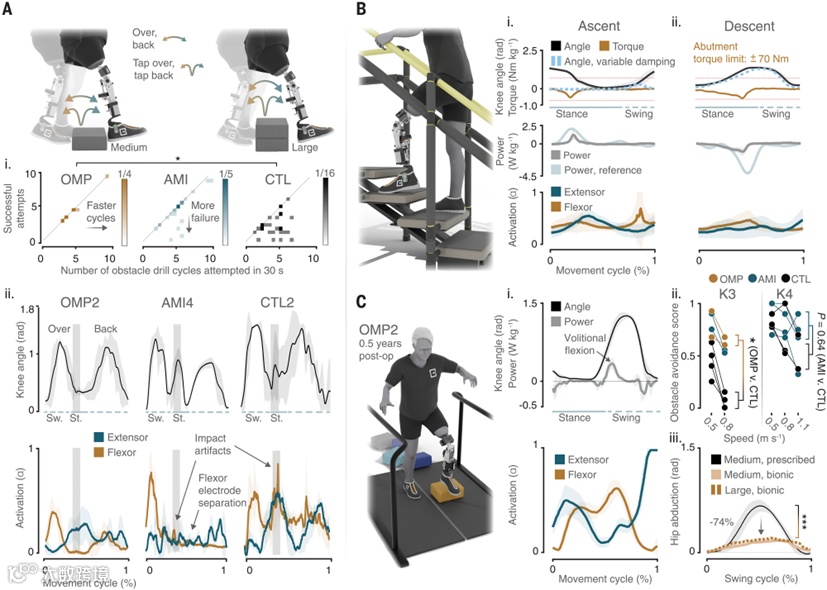 佩戴骨整合机械神经假体的受试者可以通过自主屈伸其假肢来克服行走路径上的障碍