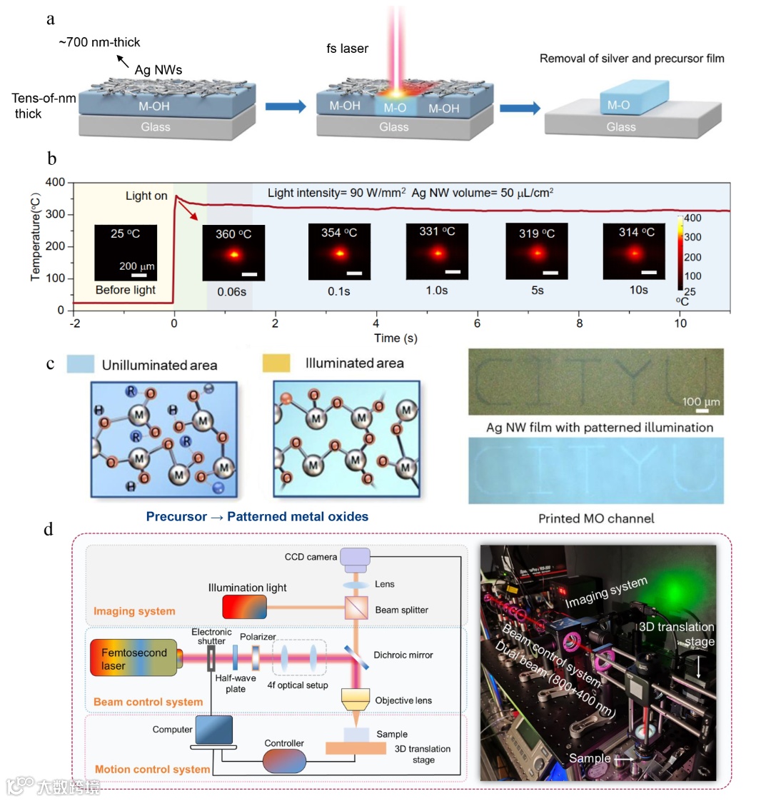 如图2a所示,研究团队在金属氧化物前驱体薄膜表面喷涂一层约700 nm厚的银纳米线,在飞秒激光照射下,纳米线交叉点形成等离激元纳腔“热点”,使局部温度快速升高至360 °C以上(图2b,红外相机实测),热驱动前驱体材料向金属氧化物薄膜的局部定向转化(图2c左);通过精确控制飞秒激光扫描系统诱导空间选择性加热(图2d),实现金属氧化物材料的直接图案化打印,最后去除银纳米结构并在溶液中溶解残留前驱体材料,即可得到光热打印的高质量、图案化金属氧化物薄膜(图2c右)。