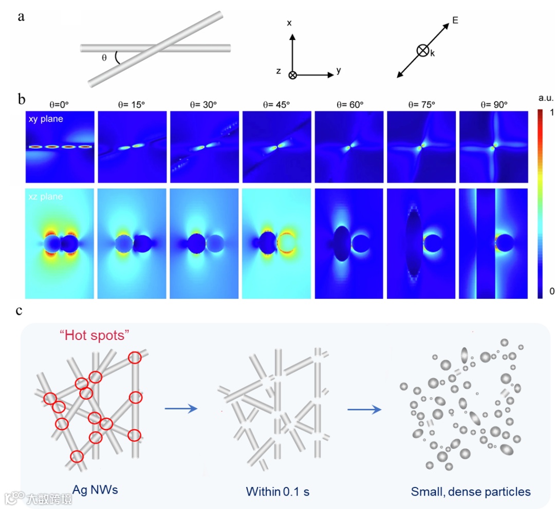 当两根银纳米线处于不同夹角时,如图3a-3b所示,在纳米线交接处可产生极大的电场增强。等离激元“热点”将会在纳米线交叉处形成,其光热效应会使得交叉点位置处迅速升温,纳米线受热产生形貌变化,进而变成细小密集的纳米颗粒(图3c)。