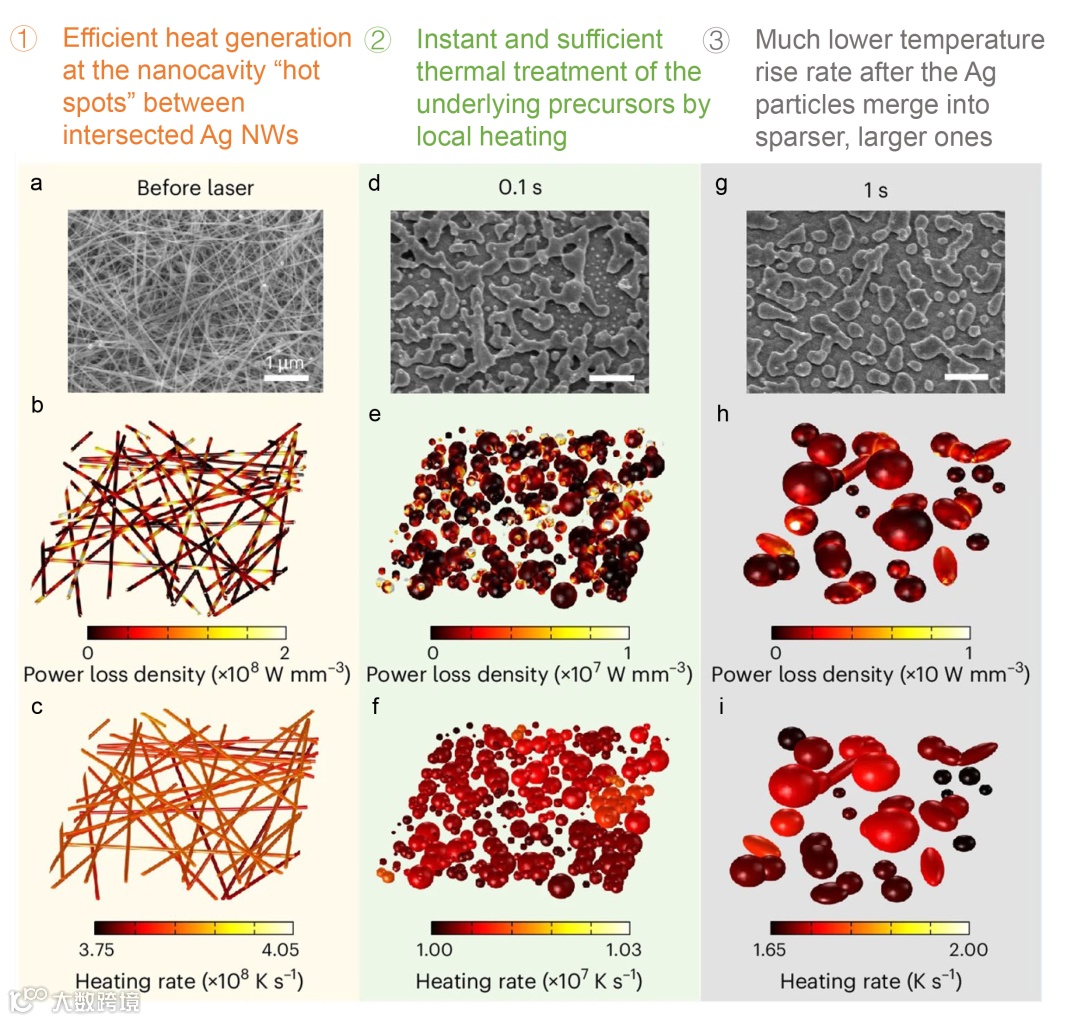 通过计算不同飞秒激光辐照时间下的等离激元光热效应,研究发现该过程可分为三个主要阶段:初始阶段(激光照射开始时),等离激元纳腔“热点”在银纳米线交叉处形成,表现出最高的光吸收效率(图4a-4b),同时具备最大局部加热速率(图4c);随着局部加热使交叉处温度快速升高以致熔化,部分银纳米线逐渐转变为细小且密集排列的纳米颗粒,此时光吸收效率和局部加热速率均下降约一个数量级(图4d-4f),但是得益于被辐照的纳米颗粒集体加热贡献,整体升温速率仍保持较高水平;最后,这种显著的局域加热效应促使相邻的小颗粒/不规则组装体发生合并,逐渐形成更大且较稀疏的颗粒结构(图4g),此过程中热量产生速率逐渐降低,并最终完成银纳米线形态演化(图4h-4i)。