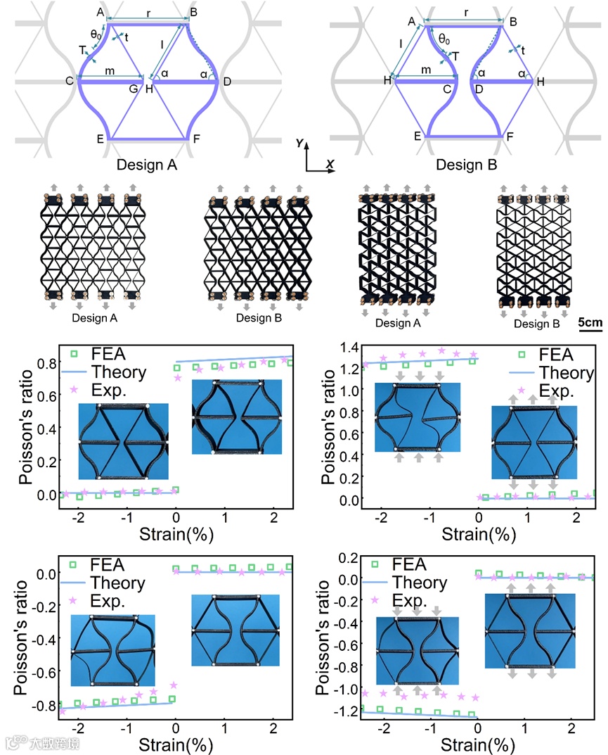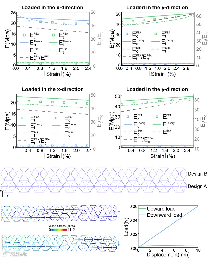 实验与数值仿真结果明确证实了其独特的力学响应。当该材料沿特定方向受压或受拉时,超材料胞元内部构件发生屈曲,其行为表现出常规的正泊松比或负泊松比。然而,当对该超材料进行反方向加载时,超材料内部存在拉伸和弯曲变形的竞争机制,导致其横向尺寸几乎保持不变,从而表现出零泊松比特性。这种超材料力学性能展现出类似“二极管”的单向选择性响应。