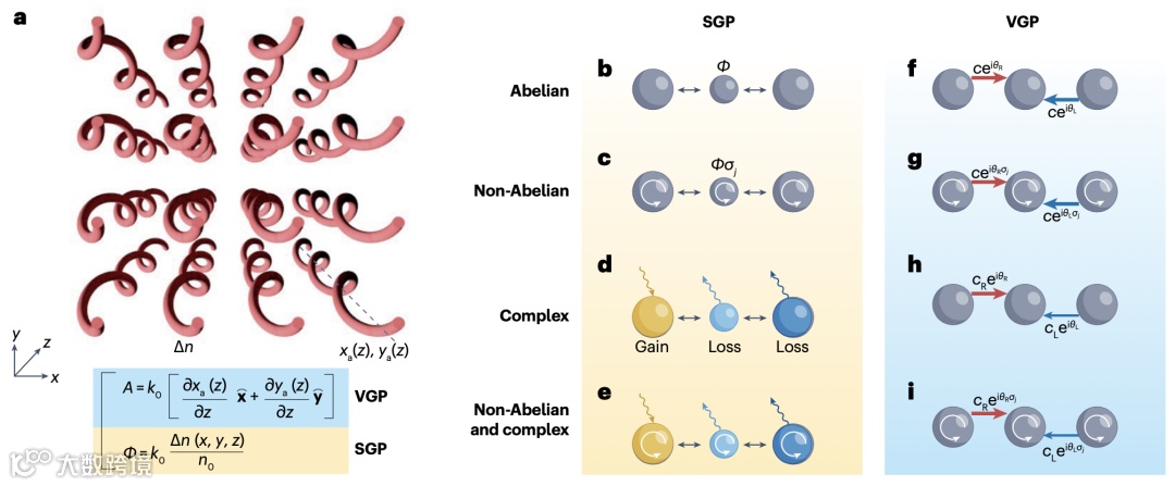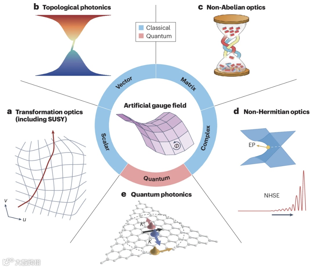 图1. 光学中的人工规范场可以是标量、矢量、矩阵或复数形式,在变换光学、拓扑光学、非阿贝尔光学和非厄米光学等领域具有重要作用,并已从经典系统扩展到量子系统。