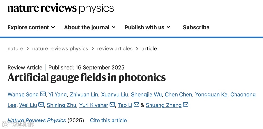 近日,南京大学李涛教授、祝世宁院士团队与香港大学张霜教授等合作者在《Nature Reviews Physics》上发表题为“Artificial gauge fields in photonics”的综述文章,系统介绍了光子学领域人工规范场的最新进展和未来发展方向。南京大学宋万鸽副教授为第一兼共同通讯作者,国防科技大学刘伟教授、澳大利亚国立大学Yuri Kivshar教授、南京大学李涛教授与香港大学张霜教授为共同通讯作者。香港大学杨易教授、深圳大学李朝红教授、柯勇贯教授,南京大学副研究员陈晨、博士生林智远、刘轩宇、吴圣杰等也为本项工作做出了重要贡献,该工作得到了祝世宁院士的悉心指导。