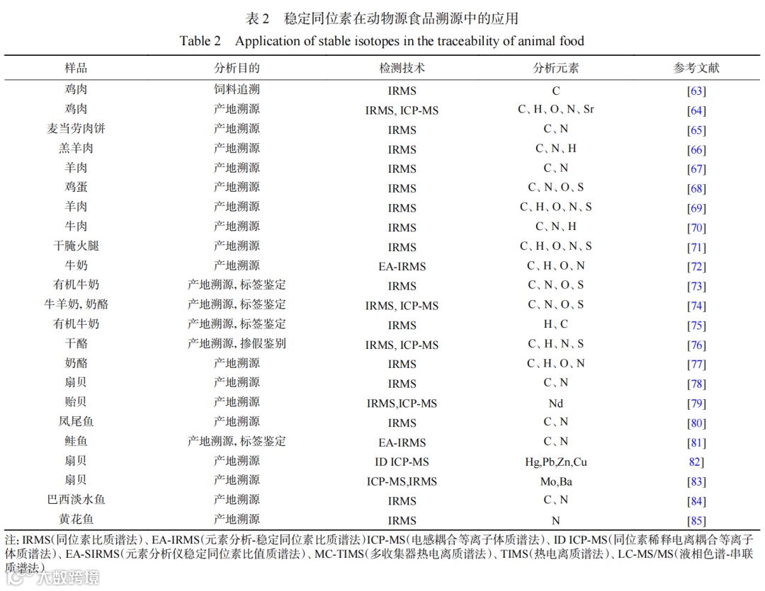 目前稳定同位素在动物源食品中的应用主要集中在牛肉、羊肉、鸡肉和乳制品等方面。动物源食品产地溯源在国外开始较早,我国的同位素溯源研究尚处在探索阶段,尤其在水产品溯源方面的研究较少。表2总结了稳定同位素在动物源食品溯源的研究进展。