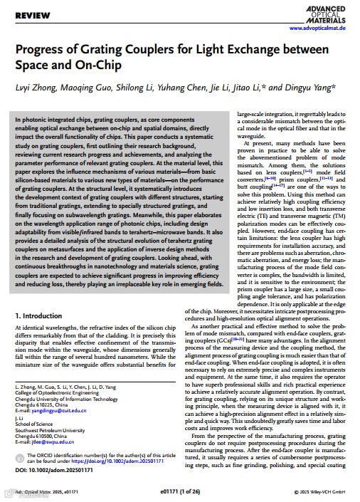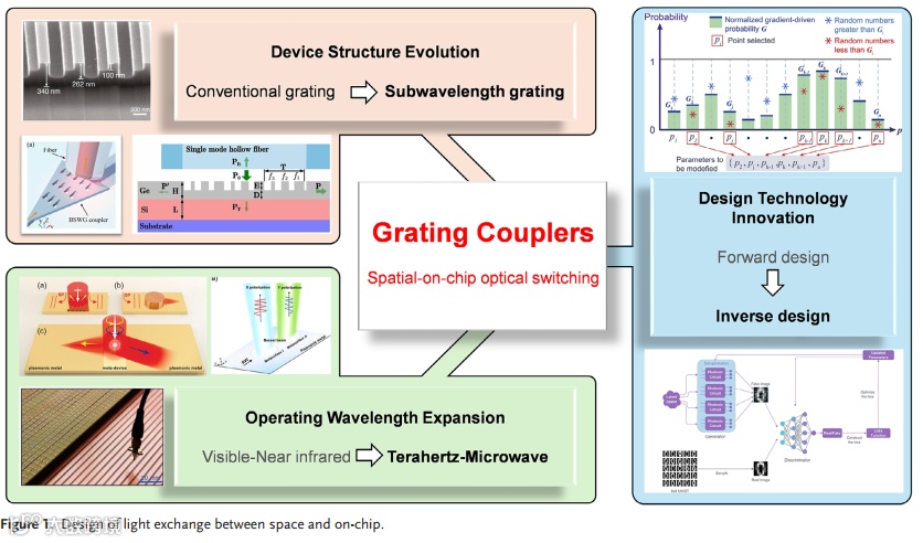 成都信息工程大学杨定宇教授团队与西南石油大学李继涛老师团队近日联合发表了关于光栅耦合器的重要综述,论文第一作者为成都信息工程大学硕士研究生钟绿怡。光栅耦合器(Grating Coupler, GC)作为实现空间与片上光交换的核心器件,直接影响光子系统的整体性能,受到学术界和产业界的广泛关注。本文从器件结构演化、设计方法革新、工作波长扩展等三个维度,全面评论了光栅耦合器的发展。文章指出光栅耦合器不再局限于传统耦合结构,开始出现功能更丰富的亚波长耦合结构;设计方法上不再局限于传统从原理到验证的正向设计过程,基于机器学习的逆向设计技术已被运用;工作波长方面也从常见的可见-红外波段扩展到太赫兹-微波段。本文从多元化的角度解读了空间与片上的光交换的发展,角度新颖,内容前沿而详实,旨在帮助研究人员全面了解这一领域。文章以" Progress in principles and methods of grating couplers for on-chip and spatial light exchange"为题发表在《Advanced Optical Materials》期刊上。