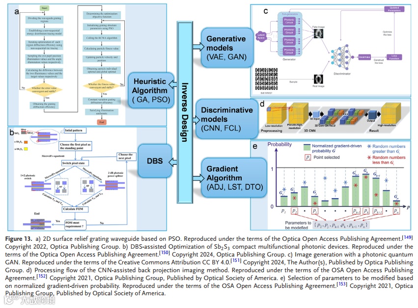 设计方法层面:逆向设计颠覆传统正向设计。结合启发式算法(Heuristic Algorithm)、生成模型(Generative models)、判别模型(Discriminative models)、梯度算法(Gradient Algorithm)等,实现“目标驱动”优化,缩小亚波长结构尺寸;针对太赫兹波段,超构表面与逆向设计结合,实现太赫兹表面等离激元(SPs)的自旋解耦波前调控,耦合效率超60%,为6G通信、太赫兹成像提供支撑。