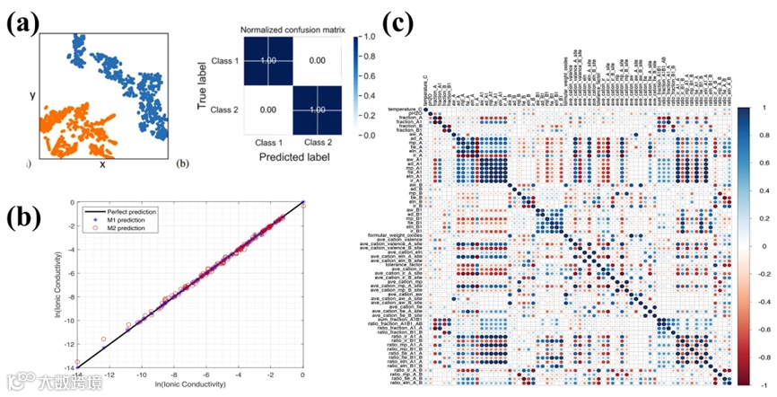 Figure 3. (a) Classification of material types [53] (Copyright 2020, Journal of Applied Physics); (b) Prediction of material properties [54] (Copyright 2022, Chemical Physics); (c) Feature relationships in the heatmap [55] (Copyright 2022, Advanced Materials).