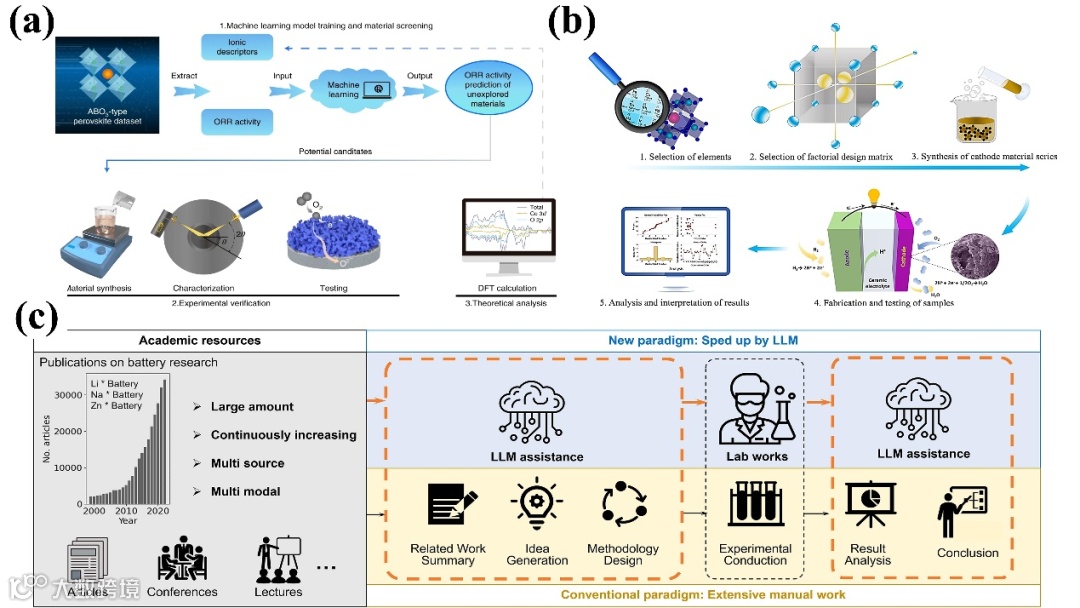 Fgure 6. (a) After ML prediction and screening, the selected materials are experimentally prepared and undergo characterization tests, which are combined with using DFT calculations to verify their properties simultaneously [73] (Copyright 2022, Nature Energy); (b) Simplified cathode material development framework based on the experimental design paradigm (EDP). Selection of elements, selection of factorial design matrix, synthesis of cathode materials series, fabrication and testing of samples, and analysis of results [74] (Copyright 2023, Chemical Engineering Journal); (c) Comparative illustration of conventional and LLM-transformed research paradigms [52] (Copyright 2023, (Copyright 2024, Chemical Engineering Journal)).
