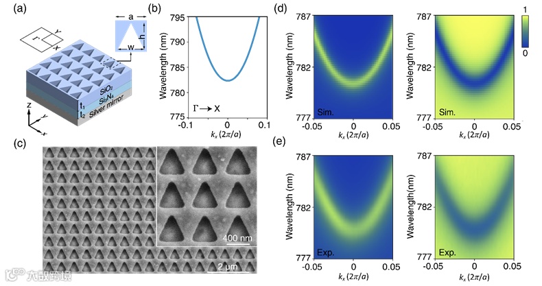 图2展示了研究团队具体设计和实验制备的光子晶体平板及其光谱表征结果。实验结果表明该结构可以实现高交叉极化率和低同极化率,与理论设计一致。