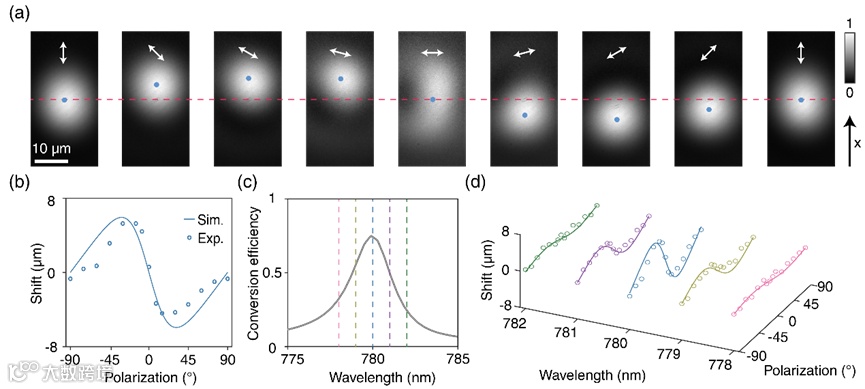 研究团队测量了光束位移,并在改变入射偏振时测量了光束位移的演化(图4)。对于确定的入射光波长,实验上直接观测到了光束位移大小随入射光偏振变化而连续变化。由于光子能带的特性,光子晶体所实现的位移调控范围还可受到入射光波长的调控。在波长约 780 nm 时,对应于最高转化率,最大的位移范围达到14倍波长。随着入射波长偏离最大转化率的波长,光束位移的最大值有所减小,基于此可以实现不同的光束位移量最大连续调控范围。