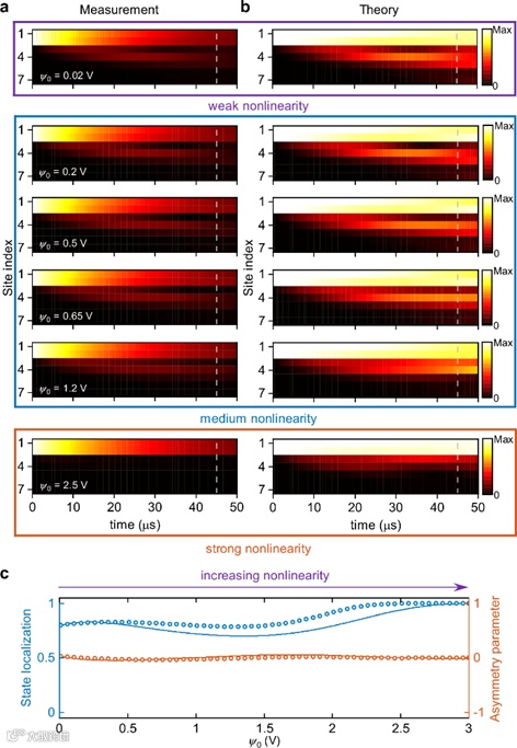 此外,单节点激励实验(图5a-b)显示:弱激励信号下(弱非线性),电压分布局域性较弱;强激励信号下(强非线性),局域性接近1,表明电压高度局域于最左端格点。该结果验证了非对称拓扑平庸边缘孤子的存在。