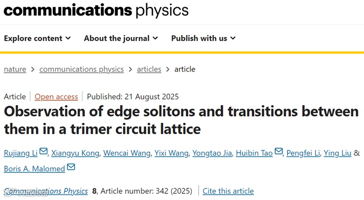 近日,西安电子科技大学李汝江副教授联合以色列特拉维夫大学Boris A. Malomed教授等提出了一种在电路晶格中实现淬火动力学的实验方案。基于该方案,研究人员成功观测到拓扑非平庸边缘孤子与拓扑平庸边缘孤子,并揭示了二者之间的转变机制。该研究为复杂非线性拓扑电路晶格中非线性拓扑态的选择性激发提供了一种普适性方法。相关成果以“Observation of edge solitons and transitions between them in a trimer circuit lattice”为题,发表在《Communications Physics》期刊上。