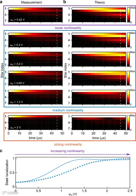图5. 单节点激励下的淬火动力学。a, b不同大小的激励信号下,格点电压复振幅的模随时间的演化。(a)和(b)分别为实验和理论结果。c电压分布的局域性与激励电压的关系,其中散点和实线分别代表实验和理论结果。