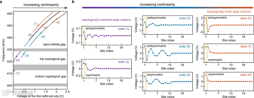 通过同相激励方案(图4a-b),团队进一步观测到弱非线性下的对称拓扑非平庸边缘孤子及强非线性下的对称拓扑平庸边缘孤子。通过调节非线性强度,成功实现了两类孤子间的转变。值得注意的是,无论是反相还是同相激励,在不同强度的非线性下,电压分布的对称性始终与激励信号一致(见图3c和4c中非对称参数,以及论文中的相位测量)。