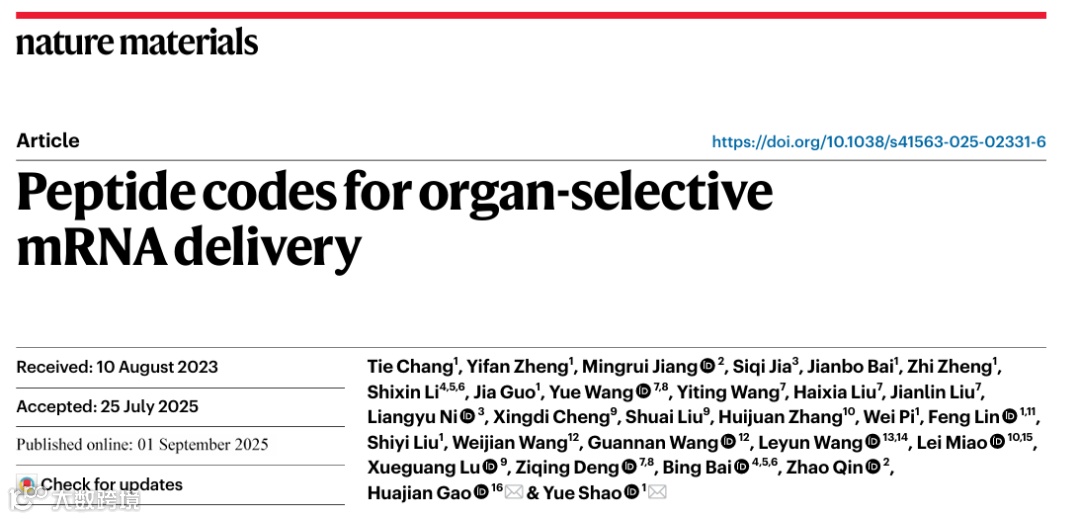 为此,清华大学邵玥副教授、高华健院士合作开发了一种名为“肽编码器官选择性靶向”(Peptide-encoded organ-selective targeting, POST)的新方法。该方法通过在LNP表面工程中引入特定氨基酸序列(POST代码),实现mRNA在全身给药后对肺、脾、肝等肝外器官的选择性递送。分子动力学模拟及实验验证表明,POST的器官选择性源于肽修饰LNP所形成的特异性蛋白冠,这一过程建立于肽与血浆蛋白之间结合亲和力的力学优化基础上。该平台不仅适用于多种核糖核酸的递送,还可用于多种基因编辑工具的器官特异性递送,显著拓宽了器官选择性递送的应用范围与多功能性。相关论文以Peptide codes for organ-selective mRNA delivery为题,发表在《Nature Materials》,第一作者为Chang Tie。