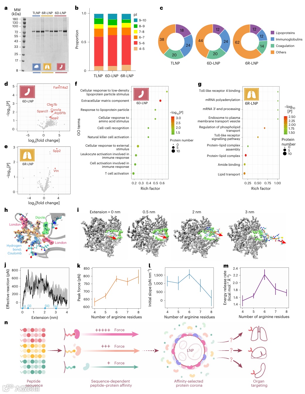 图3 | POST代码的器官选择性机制 a. 血浆蛋白的SDS-PAGE分析;b. 蛋白冠中top50蛋白的等电点分布;c. 蛋白冠的生理类别分布;d–e. 差异吸附蛋白的火山图;f–g. GO富集分析;h. 6R-Vtn分子组装模型;i. SMD模拟轨迹快照;j. 力-延伸曲线;k–m. 不同R数量的峰值力、初始刚性能量释放率;n. POST代码通过蛋白冠签名实现靶向的示意图。