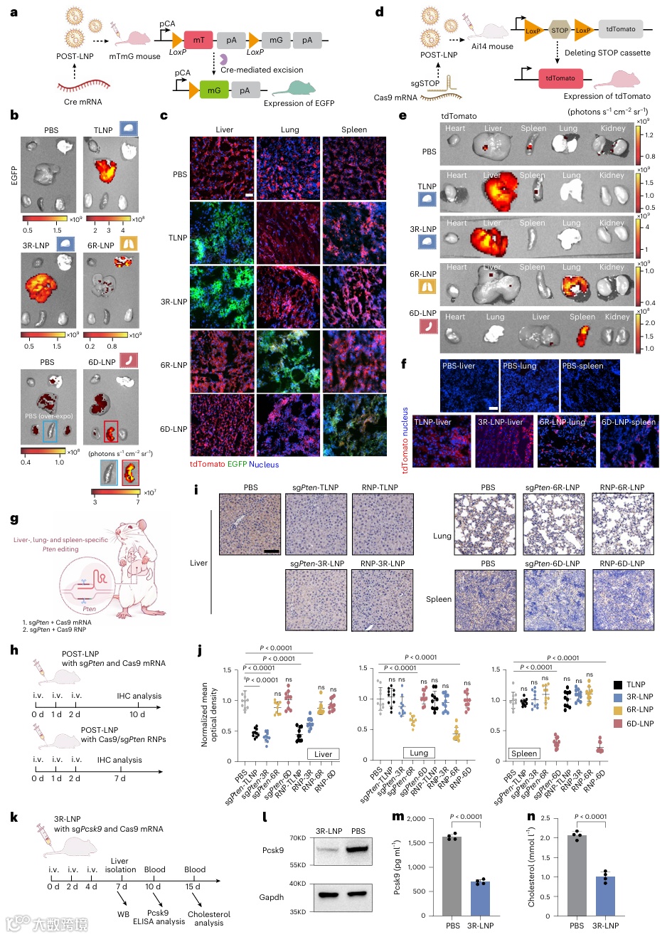 图6 | POST代码实现器官选择性基因编辑 a. Cre mRNA编辑实验设计;b. 离体器官EGFP荧光图像;c. 组织切片的共聚焦荧光图像;d. CRISPR/Cas9编辑实验设计;e. 离体tdTomato荧光图像;f. 组织切片荧光图像;g. Pten编辑实验设计;h. 编辑流程;i. PTEN免疫组化图像;j. 平均光密度定量;k. Pcsk9编辑实验设计;l. Western blot结果;m. 血浆Pcsk9水平;n. 血浆胆固醇水平。