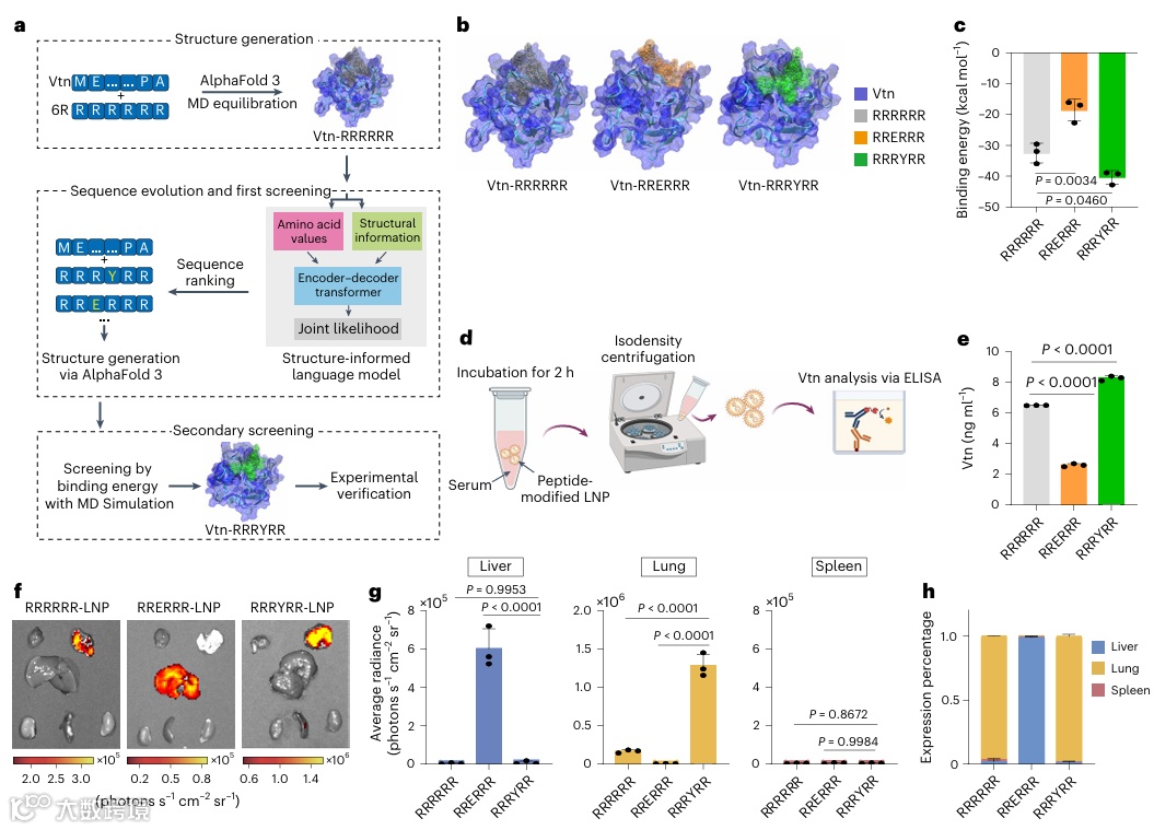 图4 | 肺趋向性肽序列的理性设计 a. AI辅助设计流程图;b. AlphaFold 3生成的肽-Vtn复合物结构;c. 结合能计算;d. Vtn结合实验流程;e. ELISA检测Vtn吸附量;f. 离体器官发光图像;g. 肝、肺、脾发光定量;h. Luc相对表达比例。