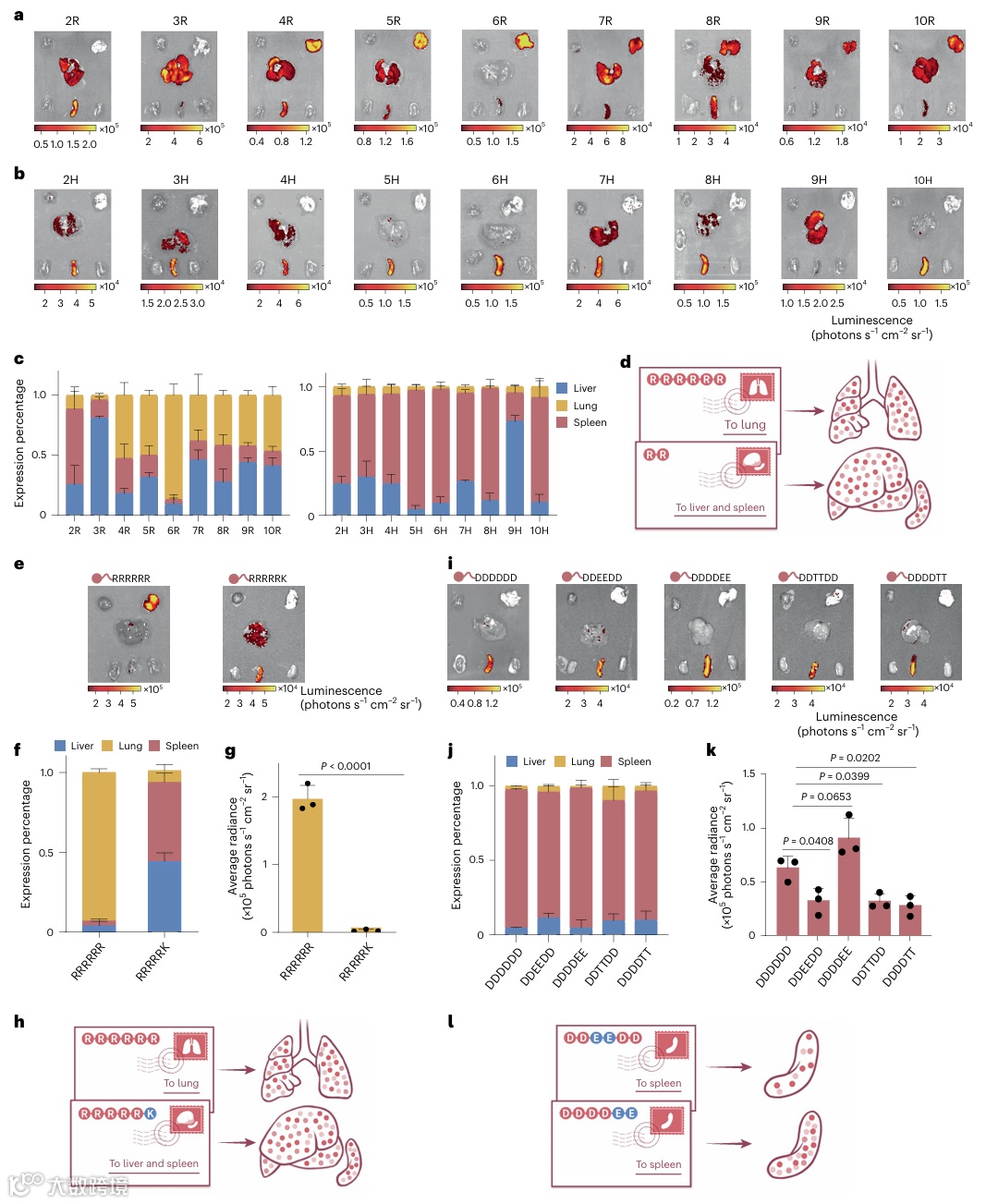 图2 | 通过肽代码调节器官选择性和递送效率 a–b. 2–10R和2–10H肽修饰LNPs的离体发光图像;c. Luc在肝、肺、脾中的相对表达;d. 通过肽长度切换器官选择性的示意图;e–g. 点突变实验及肺发光定量;h–k. 点突变对脾靶向的影响及发光定量;l. 通过序列重排调节递送效率的示意图。