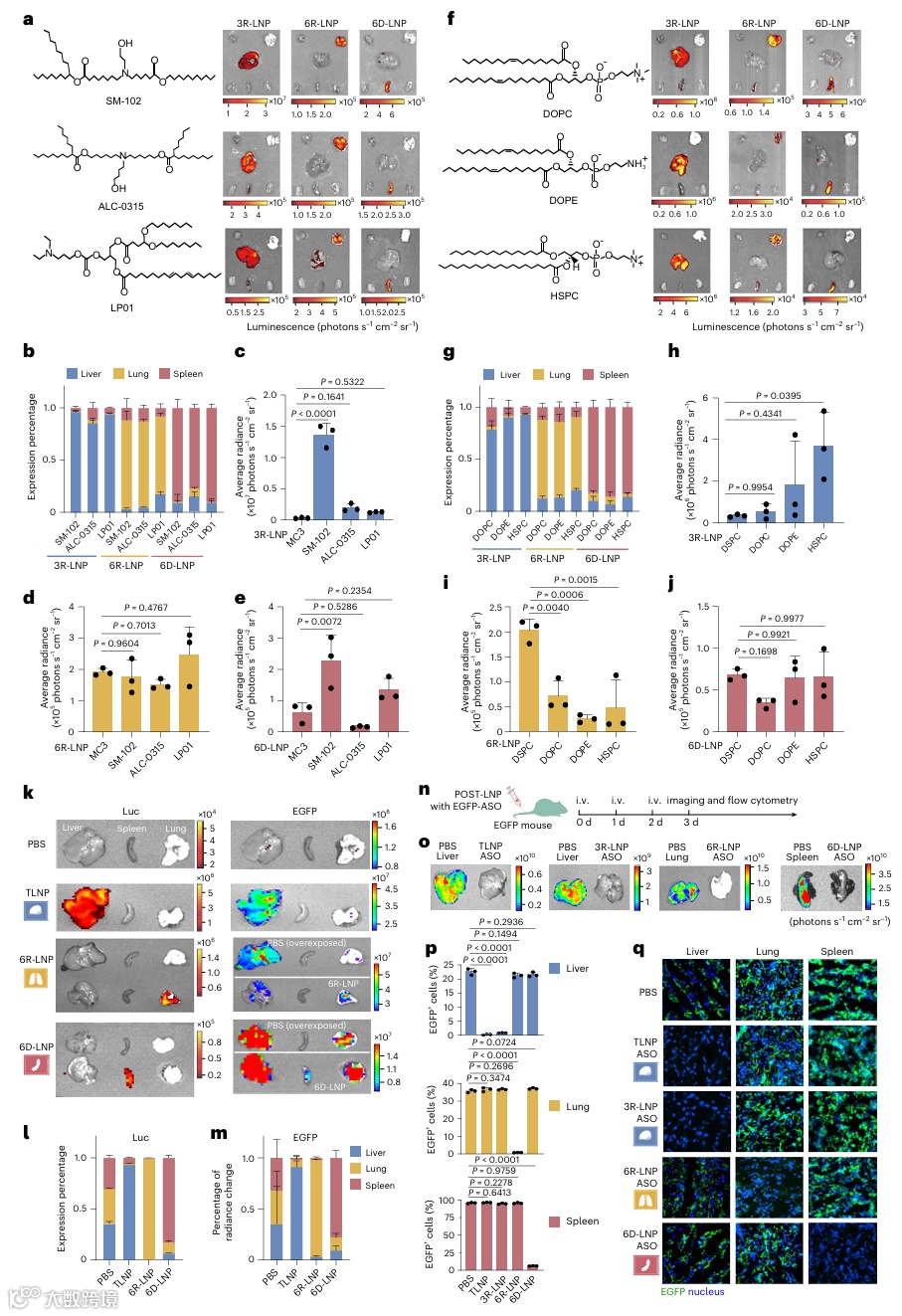 图5 | POST代码作为通用平台 a–b. 不同可电离脂质下的器官发光图像与相对表达;c–e. 肝、肺、脾发光定量;f–g. 不同磷脂下的发光图像与相对表达;h–j. 肝、肺、脾发光定量;k–m. 多mRNA递送结果与EGFP表达变化;n–q. ASO递送实验设计、离体荧光图像、EGFP+细胞比例及组织切片荧光图像。