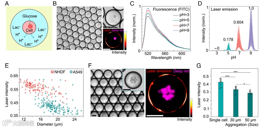 图5:单细胞/多细胞代谢分析。(A)反应原理:细胞代谢产乳酸,pH下降,进而引起FITC激光强度变化。(B)单细胞封装:红色染料标记细胞,绿色为激光。(C)不同pH下FITC荧光响应。(D)不同pH下FITC激光响应。(E) NHDF与A549单细胞激光强度差异,反映细胞间代谢速率的异质性。(F)包含A549细胞球的液滴激光。(G)细胞球体积与激光强度关系(体积越大,酸化越严重)。