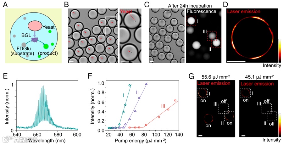 图6:单酵母β-葡萄糖苷酶分泌阈值分选。(A)非荧光FDGlu被酵母BGL水解为可发荧光的荧光素,进而产生激光增益。(B)单酵母封装示意。(C)24小时后,不同酵母产生的荧光。(D)包含单个酵母的水滴激光照片。(E)激光光谱示例。(F)不同酵母水滴激光阈值差异显著(35–79 μJ/mm²)。(G)通过调节泵浦强度实现阈值门控筛选:55.6 μJ/mm²时Ⅰ、Ⅱ亮,45.1 μJ/mm²仅Ⅰ亮,完成高分辨筛选。
