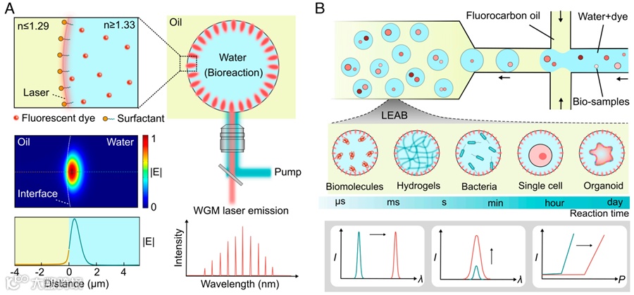 图1:LEAB概念示意。(A)水相液滴(含染料)被氟碳油包裹,形成WGM激光微腔;氟碳油折射率小于水折射率。谐振光场大部分被束缚在水滴中,与里面的生化反应发生作用,引起激光光谱的变化。(B)通过微流控可大规模生产含类器官/细胞/酶/分子的激光水滴,实现高通量、长时程监测。图源:PNAS