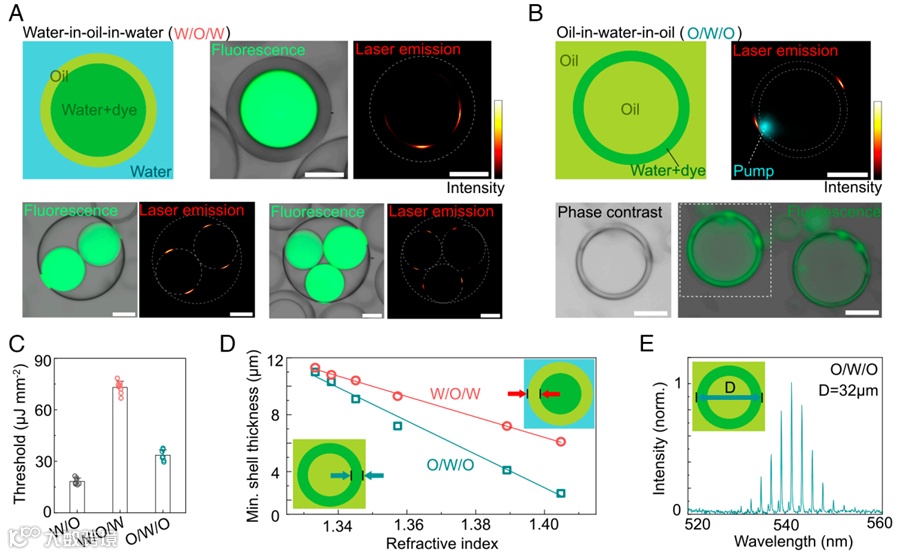 图3:双乳液LEAB激光行为。(A) W/O/W双乳液:单/双/三核水滴均可激光,激光出现在非接触位置。(B) O/W/O双乳液:水壳层同样支持激光产生。(C)三类构型阈值比较:单乳液最低,W/O/W最高。(D)水相折射率越高,维持激光所需壳层厚度越薄。(E)32μm直径O/W/O水滴激光谱。图源:PNAS