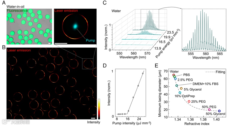 图2:单乳液LEAB光学表征。(A)微流控制备的均匀水滴荧光图。(B)水滴激光图像:每个水滴在相同泵浦下均一发光。(C)泵浦强度递增时的激光光谱。(D)光谱积分强度-泵浦能量曲线,表现出激光明显的阈值特性。(E)随水相折射率增加,可支持激光产生的液滴最小直径从65 μm降至18 μm。图源:PNAS