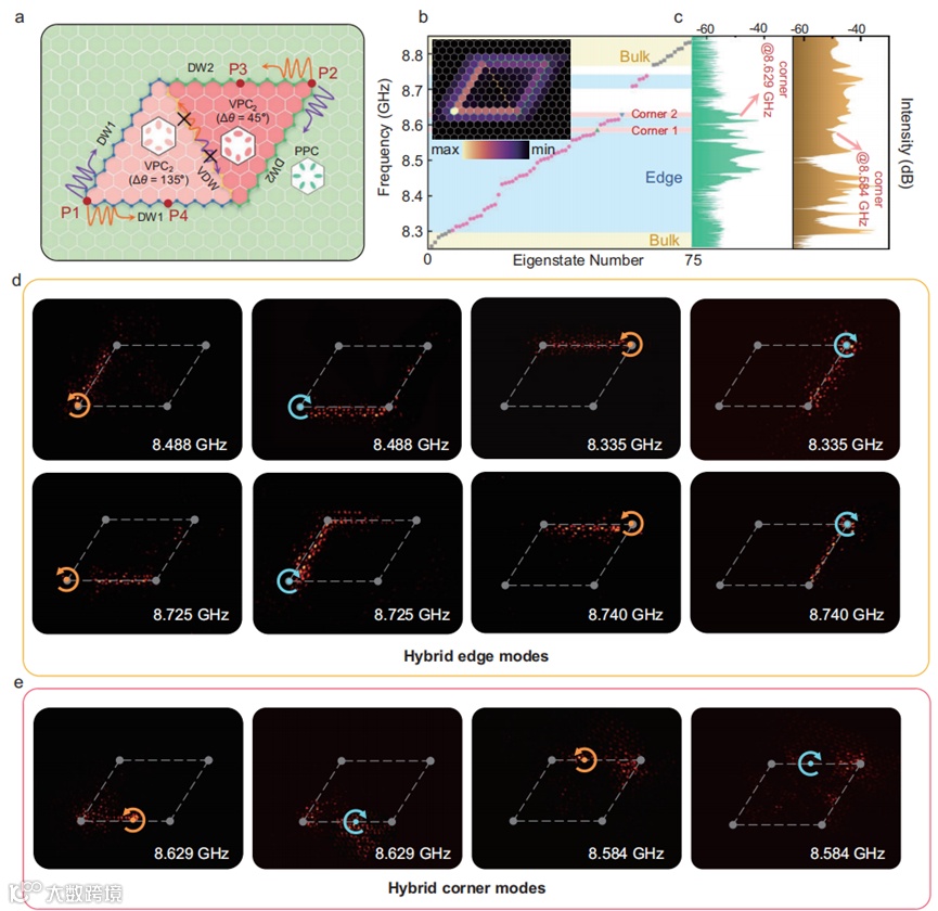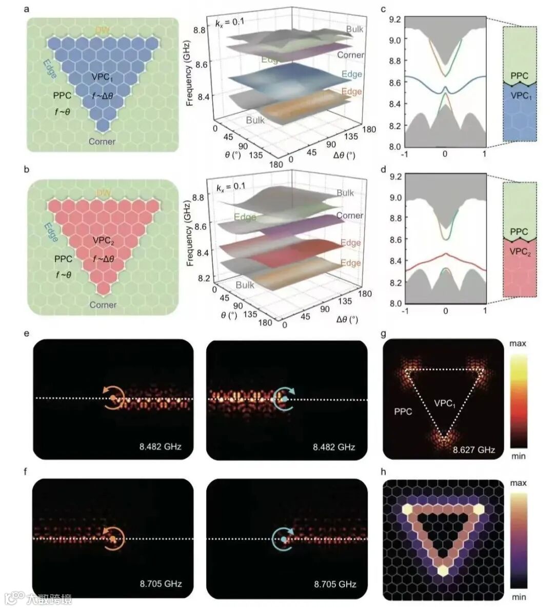 的改变,可进一步实现8条频率与自旋控制的拓扑边界态通道(图4 d)和4个双频率角态(图4 e,分别出现在8.584 GHz与8.629 GHz)。这种非对称HTP-PIC频率复用机制的演示,不同频率的边界态可在同一结构中共存且独立调控,展示了在同一芯片中实现多路信息处理与编码传输的潜力。