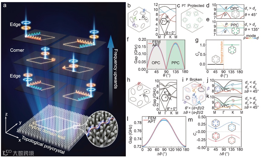 ,构建了可配置的拓扑光子多晶(TPPC)结构。研究团队采用了赝自旋-谷耦合(pseudospin-valley Hall effect, PVHE)机制,通过不同旋转角度的介质椭圆柱,构建了赝自旋晶格和谷晶格,分别可以实现两种拓扑效应,即光学体系的量子自旋霍尔效应(QSHE)和量子谷霍尔效应(QVHE),并通过畴壁工程将其组合形成复合边界。