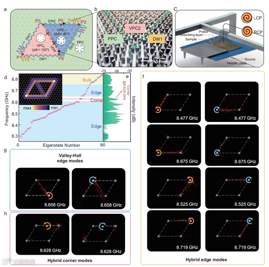 中,于同一TPPC结构中实现了多频段、多方向传播的边界态与局域角态(图2 a,b)。同时,构建赝自旋-谷耦合的超胞来研究杂化边界态的性质,在带隙内同时具有2条对应于QSHE的赝自旋边界态和1条对应于QVHE的谷边界态,且对于不同的VPC,不同谷中边界态的群速度方向相反,杂化边界态既保持了原有的本质,又产生了两种不同的群速度边界态(图2 c,d)。为了定量衡量杂化边界态和角态的局域性,研究团队定义了一个局域品质因子(Local Quality Factor)QL,QL 来源于局域态密度(LDOS)在目标频率带隙内的积分,可以定量描绘拓扑边界态的空间分布特征,辅助验证拓扑态局域的能力(图2 g)。