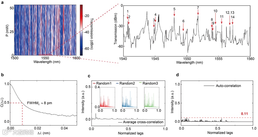 利用多个微盘光子原子之间相互的复杂模式杂化效应,在波长域产生了大量无序和混沌的光子分子轨道。通过对器件进行线性扫描外部加热功率,生成了具有高度无序行为的准随机响应矩阵,如图2.a所示。响应矩阵的列正交性由自相关函数评估,达到~0.1的水平;行相关性由互相关函数评估,达到低于0.1的水平;基于微盘谐振腔和光子分子配置的高Q特性,由相关函数预估的光谱分辨率低至8 pm(图2.b, c, d)。