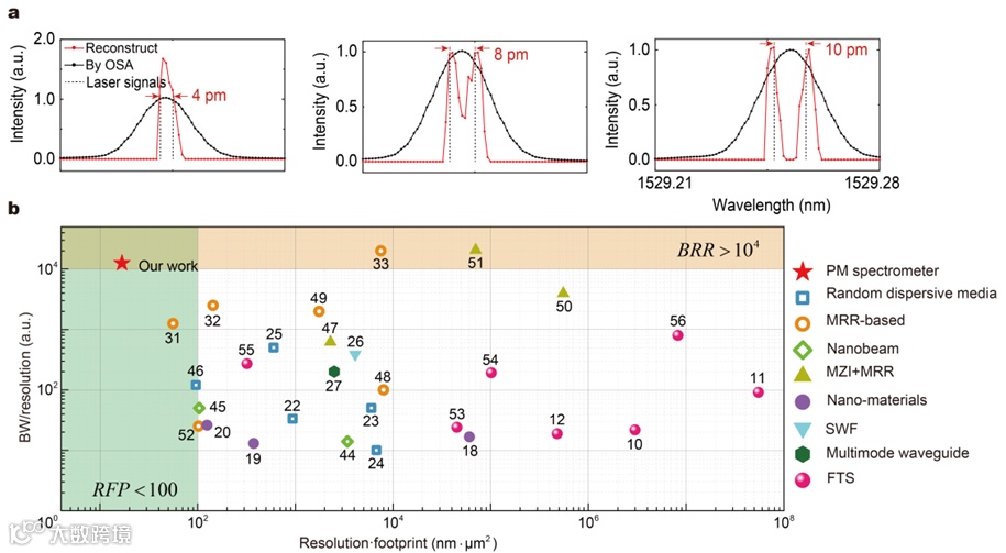 基于高质量的响应矩阵,实验证明了超过100 nm 的宽可测带宽和8 pm的超高光谱分辨率,同时满足了瑞利判据,如图3(a)所示,器件尺寸仅为70×50 μm²。这种高分辨率的实现,得益于光子分子系统中高度无序的锐利共振峰,这些共振峰提供了丰富的光谱信息,使得设备能够分辨非常接近的光谱线。器件性能和其他片上光谱仪的对比展示在图3(b),达成了创纪录的超低低分辨率和尺寸值乘积这一性能指标,和高达12500的带宽/分辨率指标。