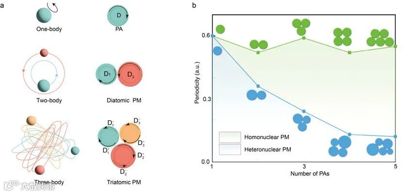 图1. (a) 一体、二体和三体引力系统,以及相应的、类似的光子原子或分子系统;(b) 周期性关于同核和异核光子分子中光子原子数量的函数。