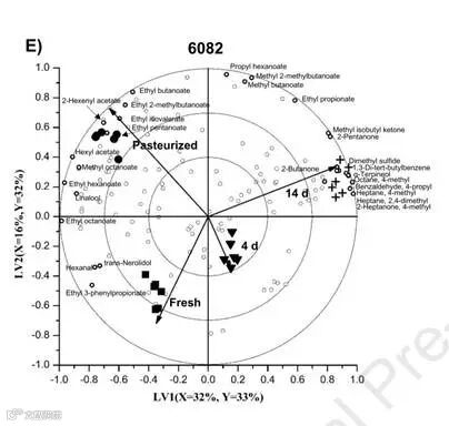 2、在储存过程中,所有品种都发生了酯类、醇萜、己醛的损失和不良风味(如二甲基硫醚、a-松油醇和碳氢化合物)的形成,而糖含量保持不变。