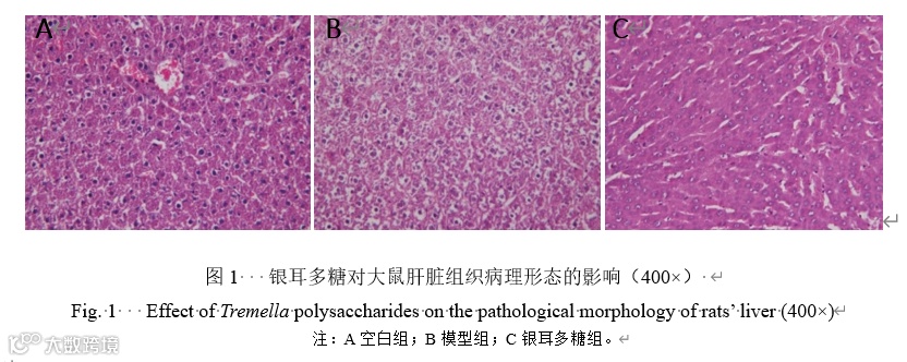病理结果(图1)表明,空白组大鼠的肝组织结构正常,肝小叶结构清晰,肝组织细胞清晰可见,无脂肪组织增生;模型组肝细胞脂肪变性明显,伴有炎性细胞浸润和脂肪结缔组织增生;银耳多糖组的肝组织细胞情况有明显改善,肝组织细胞相对清晰、部分肝细胞表现为弥漫脂肪变性及胞浆疏松化,但大部分肝细胞结构正常。由此可见,银耳多糖可降低大鼠肝脂肪蓄积,减轻肝脏的脂肪变性程度。