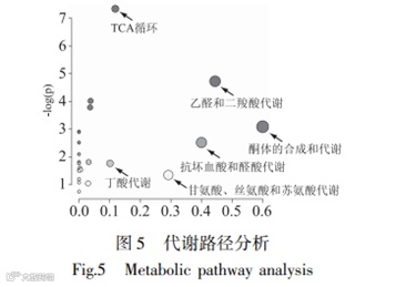 lyst.ca/)的代谢通路分析筛选影响因素大于0.1的代谢通路为主要影响的代谢通路。如图5所示,这12种标志性代谢物主要涉及酮体的合成和代谢,乙醛和二羧酸代谢,抗坏血酸和醛酸代谢,甘氨酸、丝氨酸和苏氨酸代谢,TCA循环和丁酸代谢等6种代谢途径。