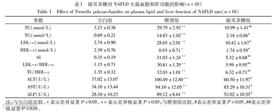1 银耳多糖对NAFLD大鼠血脂和肝功能指标的影响