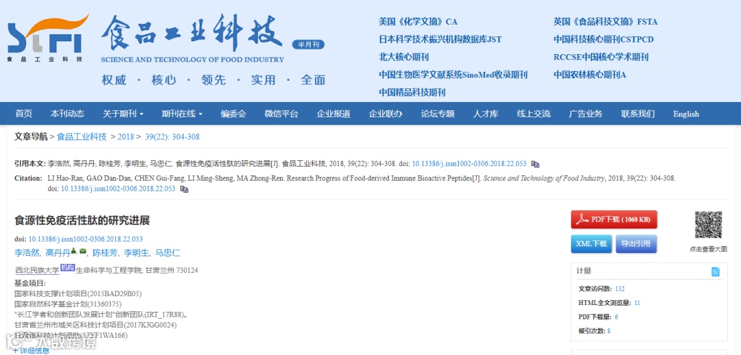 [4]Dandan Gao, Fumei Zhang, Zhongren Ma, Shien Chen, Gongtao Ding*, Xiaojing Tian & Ruofei Feng (2019) Isolation and identification of the angiotensin-I converting enzyme (ACE) inhibitory peptides derived from cottonseed protein: optimization of hydrolysis conditions, International Journal of Food Properties, 22:1, 1296-1309, DOI: 10.1080/10942912.2019.1640735.